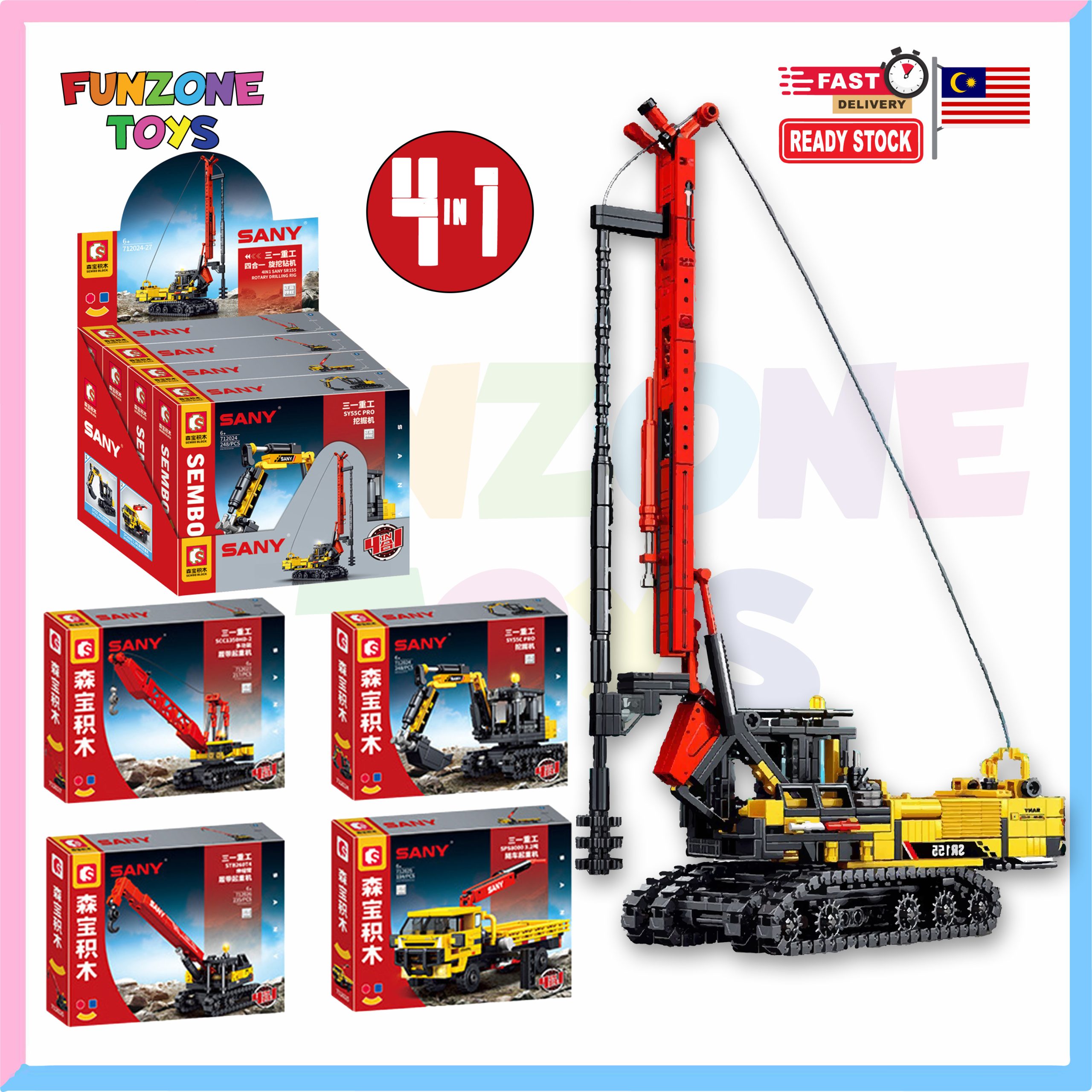 Bring construction sites to life with the officially licensed SANY Engineering Vehicles from Sembo Block! This 4-in-1 set lets you build four different construction vehicles, including a rotary drilling rig, excavator, dump truck, and crane, each packed with realistic details and movable parts.